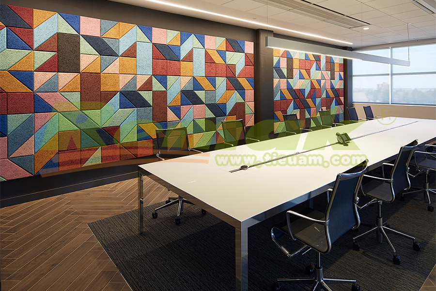 The most common application is to partly cover a wall. From the acoustic point of view it is ideal to install wall panels on two adjacent walls in order to avoid flutter echo.