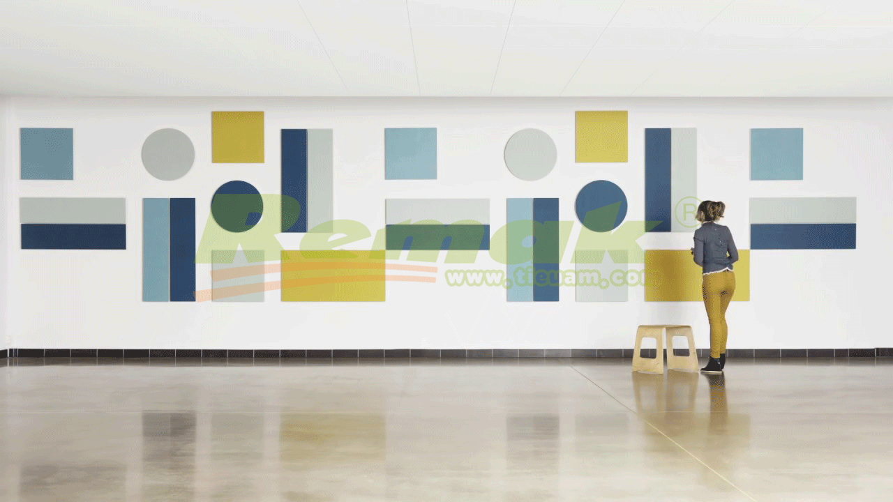 The wall absorbers should be placed at the height of people’s ears in both the sitting and standing positions.